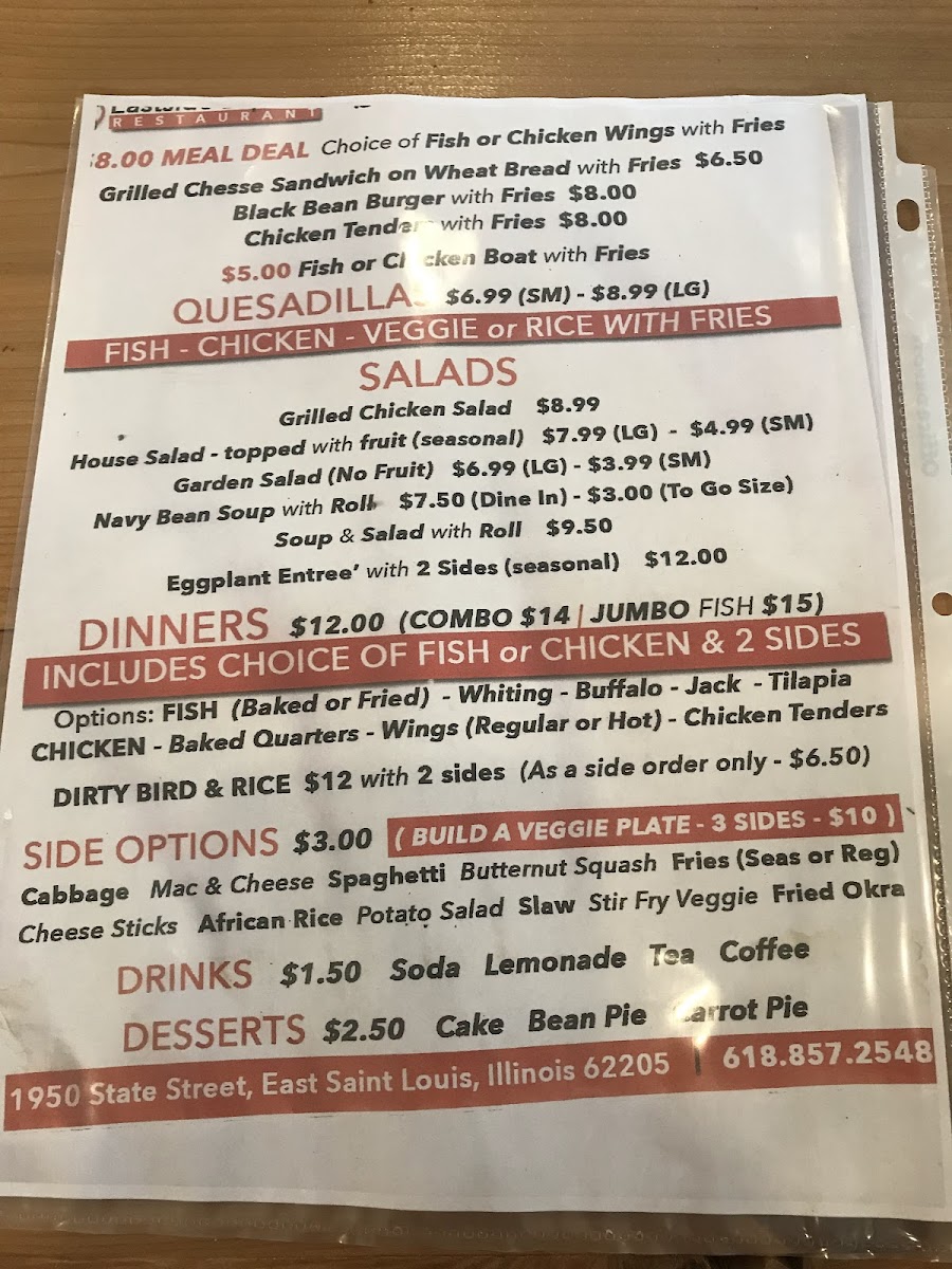 Nestled in the heart of East St Louis at 1950 State St, Eastside Express Restaurant invites you to embark on a delightful culinary adventure with our thoughtfully curated menu. Our offerings cater to every palate, featuring a delicious array of specialties that are sure to tickle your taste buds. Take a moment to savor our signature Spaghetti, perfectly seasoned and cooked to perfection, or indulge in the hearty warmth of our Wings and Fish Dinners. For a twist on classic comfort food, try our Chicken or Fish Quesadillas, or enjoy the simplicity of a Grilled Cheese Sandwich served with crispy Fries. Health-conscious diners will appreciate our vibrant House and Grilled Chicken Salads, each a fresh take on wholesome eating. Swing by and experience these delights for yourself; our menu promises a taste adventure that will leave you coming back for more!